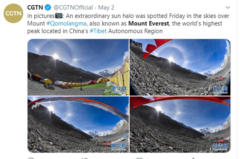 सगरमाथा क्षेत्रका केही तस्वीरसमेत राखेर सीजीटीएनको आधिकारिक ट्वीटर ह्याण्डलमा सगरमाथालाई चीनको तिब्बत स्वायत्त क्षेत्रमा पर्ने विश्वको सर्वोच्च शिखर भनेर उल्लेख गरिएको छ ।