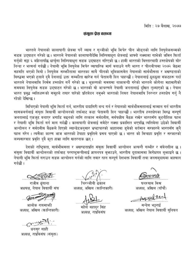 भारतको विरोधमा नेविसंघसहित सात विद्यार्थीले बुझाए ज्ञापन पत्र