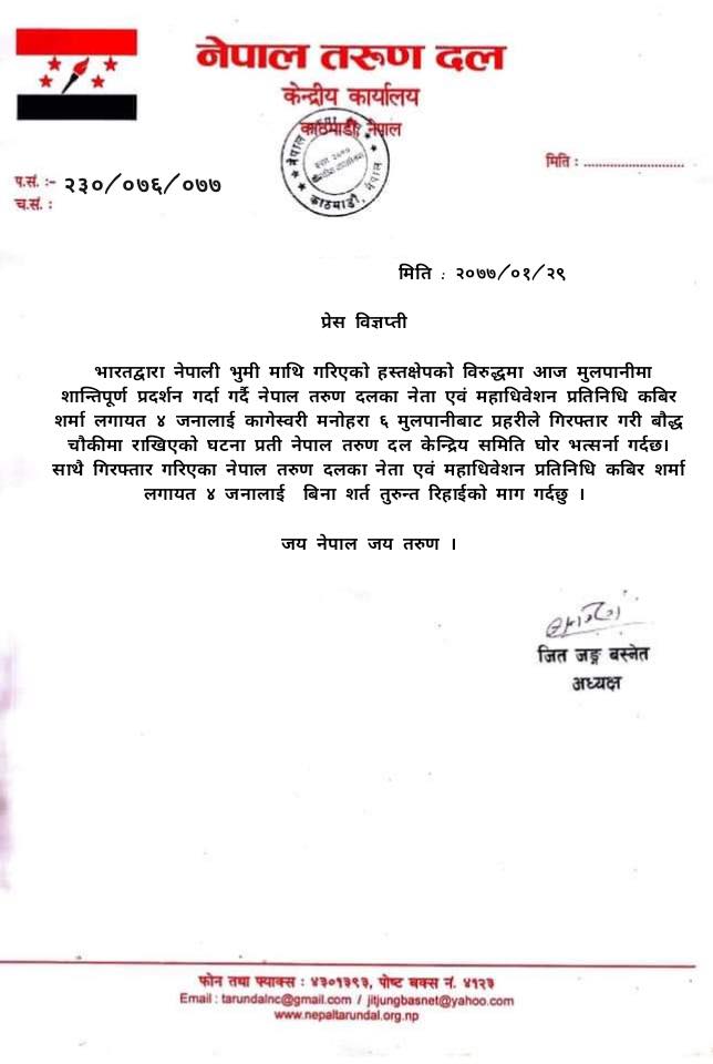 ‘भारतद्वारा नेपाली भूमिमाथि गरिएको हस्तक्षेपको विरुद्धमा मूलपानीमा शान्तिपूर्ण प्रदर्शन गर्दा नेपाल तरुण दलका नेता कवीर शर्मा लगायत चार नालाई कागेश्वरी मनोहरा ६ मूलपानीबाट प्रहरीले पक्राउ गरेर बौद्ध प्रहरीमा राखिएको छ’, अध्यक्ष बस्नेतले भनेका छन्, ‘उनीहरूलाई विनासर्त रिहाइ गरियोस् ।’