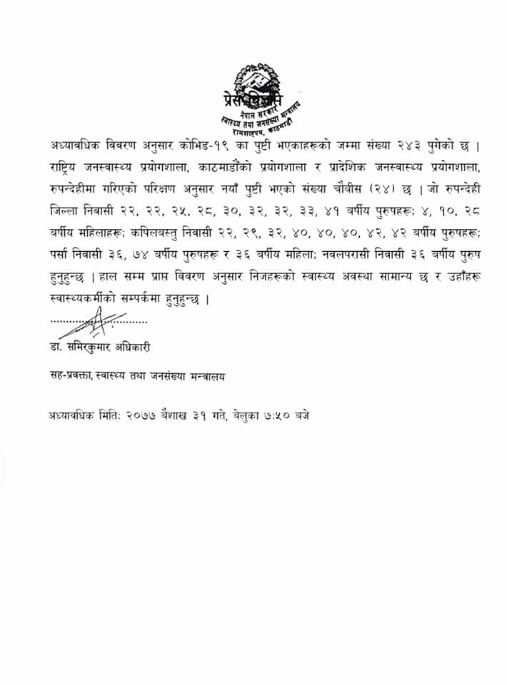 बुधबार साँझ २४ जनामा कोरोना पुष्टि, नेपालमा २४३ पुग्यो संख्या