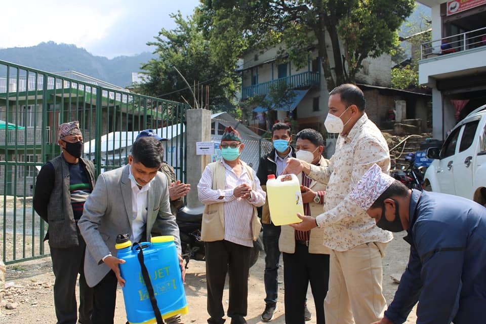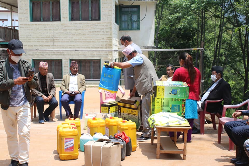 उनले प्रत्येक गाउँपालिकालाई २० लिटरका दरले ८ वटा गाउँपालिकामा १ सय ६० लिटर सेनिटाइजर हस्तान्तरण गरेका छन् । ७५ वडा वडाहरूमा दुई लिटरको खतिवडाले सेनिटाइजर उपलब्ध गराएका छन् ।