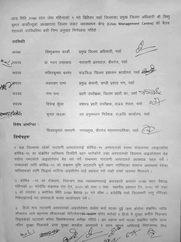 वीरगञ्जमा बुधबार संकट व्यवस्थापन केन्द्रको बैठकले सुरक्षाकर्मीहरूलाई अस्पतालबाट भाग्ने कोरोना संक्रमितलाई गोली हान्ने अधिकार दिएको हो ।