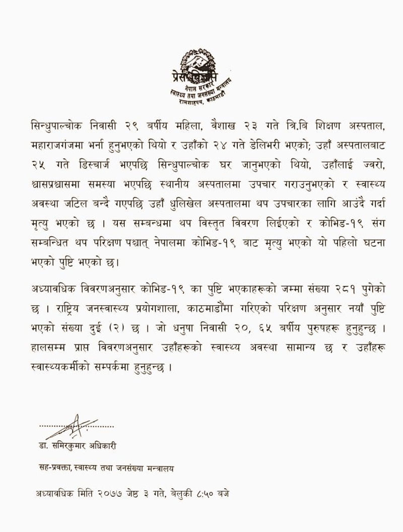 वैशाख २५ गते डिस्चार्ज भए पनि दुई दिन काठमाडौंकै डेरामा बसेर उनी वैशाख २८ गते बाह्रबिसेस्थित घर गएकी थिइन् ।