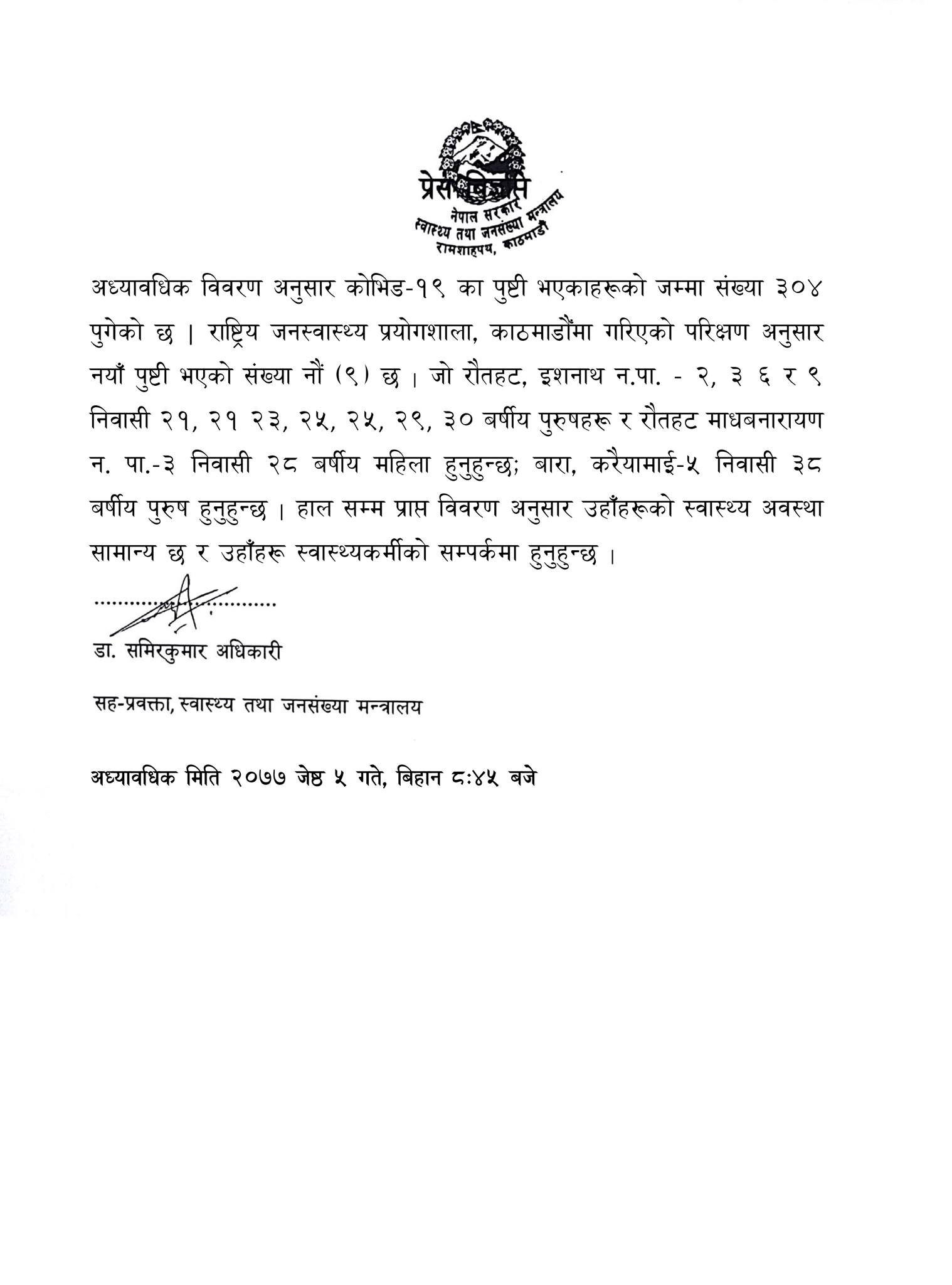 मन्त्रालयका सहप्रवक्ता डा.समिरकुमार अधिकारीका अनुसार रौतहट र बारा जिल्लामा ९ जनामा कोरोना भाइरसको संक्रमण पुष्टि भएको छ ।