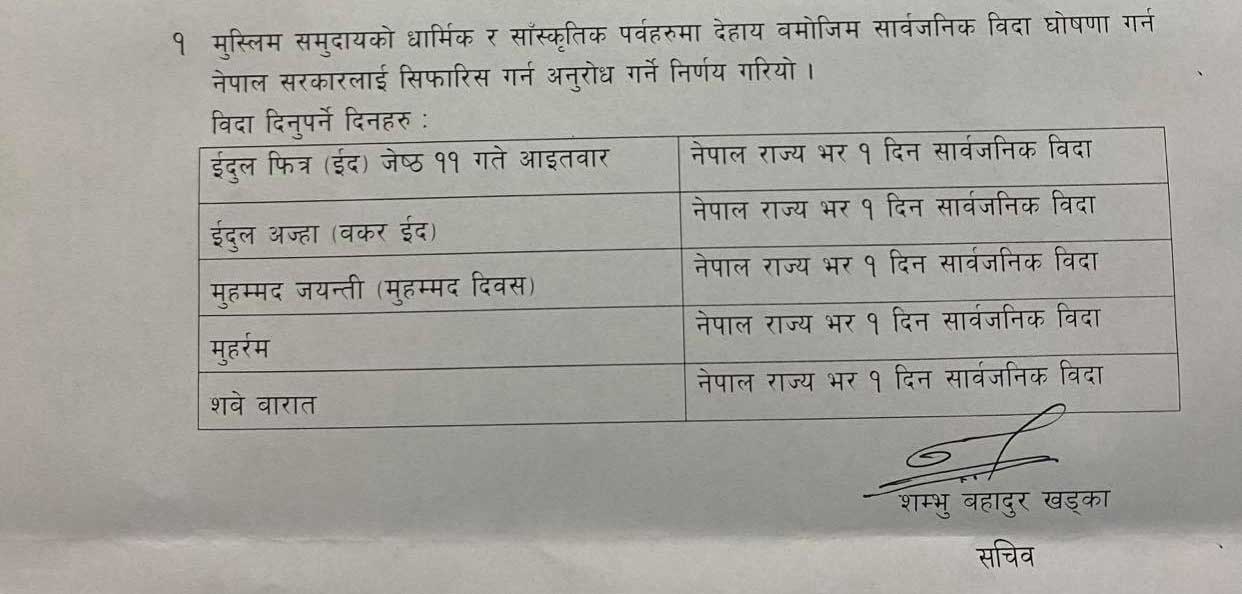 आयोगको जेठ ४ गतेको बैठकले ईदुल फित्र (ईद), ईदुल अज्हा (बकर ईद), मुहम्मद जयन्ती (मुहम्मद दिवस), मुहर्रम र शबे वारातमा एक–एक दिन सार्वजनिक विदा दिनुपर्ने मागसहित नेपाल सरकारसँग अनुरोध गरेको छ ।