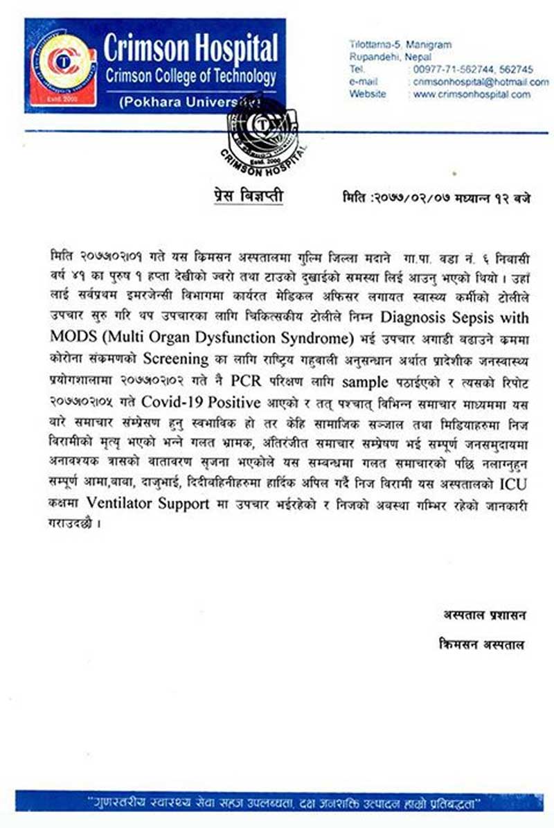 बुटवल । क्रिमसन अस्पतालले कोरोना भाइरसका संक्रमित ४१ वर्षीय शिक्षकको मृत्यु नभएको जनाएको छ ।