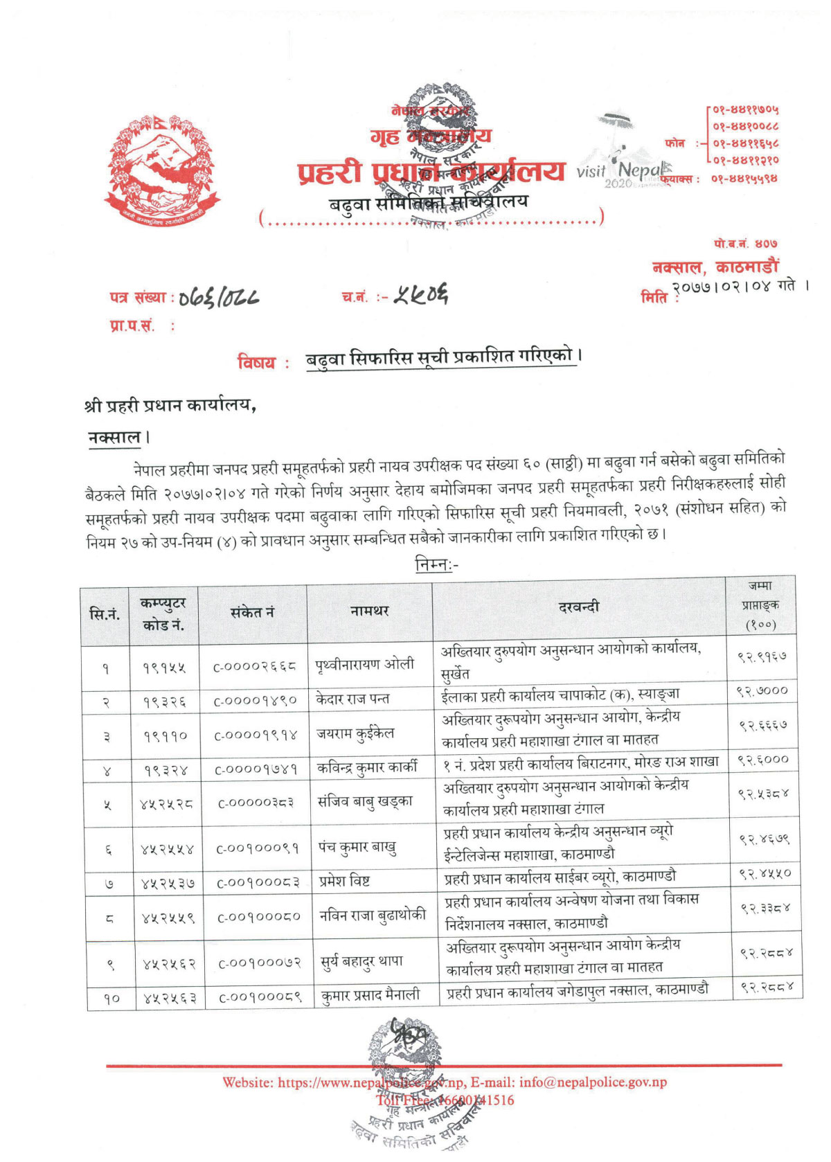 जेठ १३ गतेको गह मन्त्रालय सचिवस्तरको निर्णयबाट प्रहरी निरीक्षकबाट ६० जना प्रहरी नायव उपरीक्षक पदमा पदोन्नति भएका थिए ।
