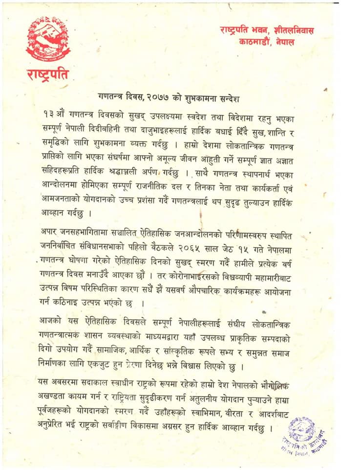 राष्ट्रपति विद्यादेवी भण्डारीको शुभकामना सन्देशमा पनि १३औँ गणतन्त्र दिवस भनिएको छ ।