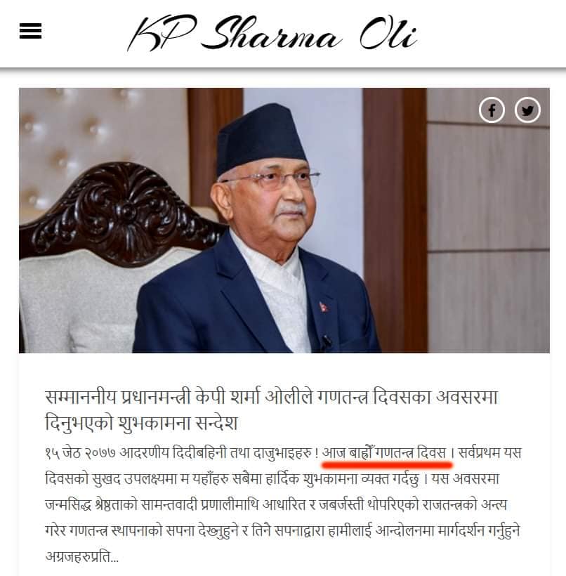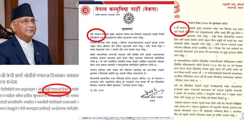काठमाडौं । झण्डै दुईतिहाइको कम्युनिस्ट सरकारका प्रधानमन्त्री खड्गप्रसाद ओलीद्वारा गणतन्त्र दिवसका अवसरमा जारी गरिएको शुभकामना सन्देशमा एक वर्ष गोलमान भएको छ ।