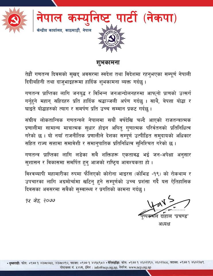 ओलीकै दल नेपाल कम्युनिस्ट पार्टी (नेकपा)का दोस्रो तहका अध्यक्ष पुष्पकमल दाहाल ‘प्रचण्ड’ले १३औँ गणतन्त्र दिवस भनेर शुभकामना दिएका छन् ।