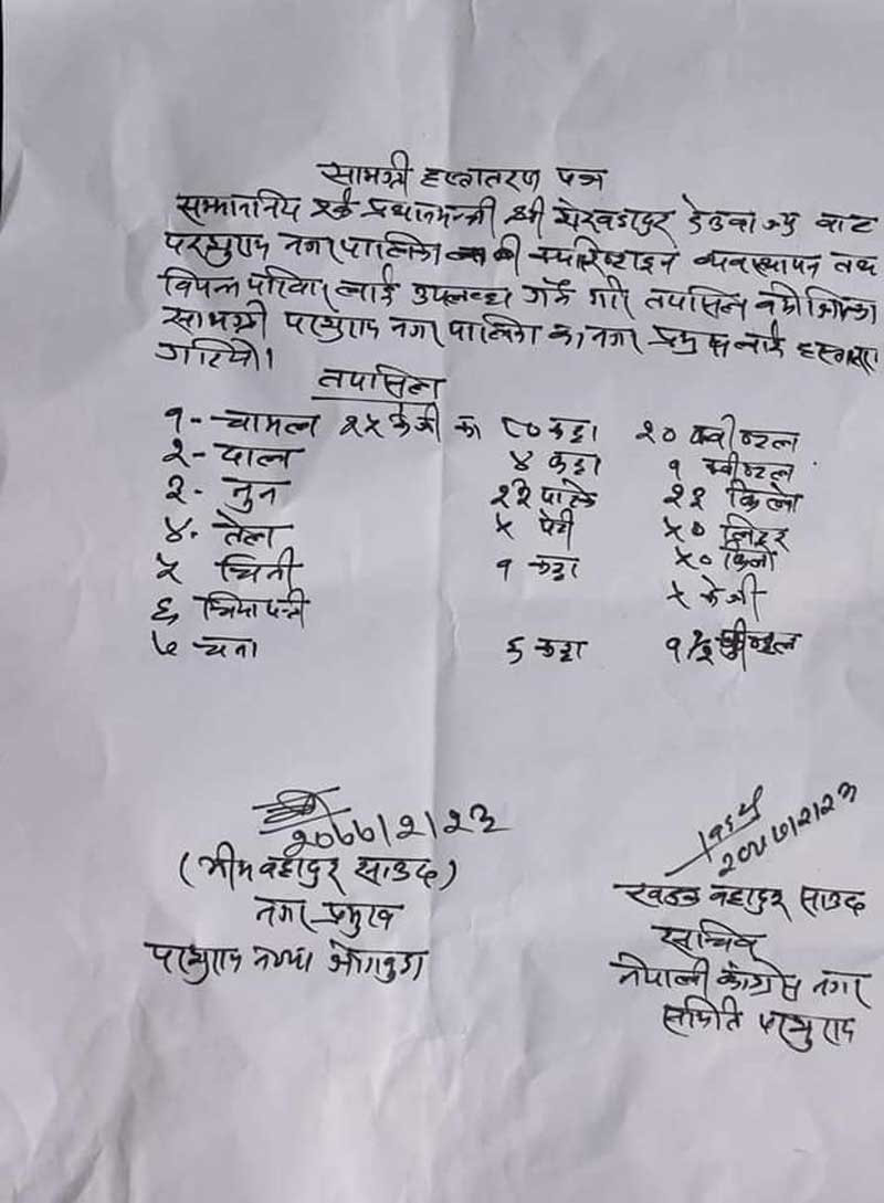 सोना मन्सुली चामल ८० कट्टा (२० क्वीन्टल), दाल १ क्वीन्टल, नुन २३ किलो, खाने तेल ५० लिटर, चिनी ५० किलो, चियापत्ती ५ किलो र चना ६ कट्टा उपलब्ध गराइएको छ ।