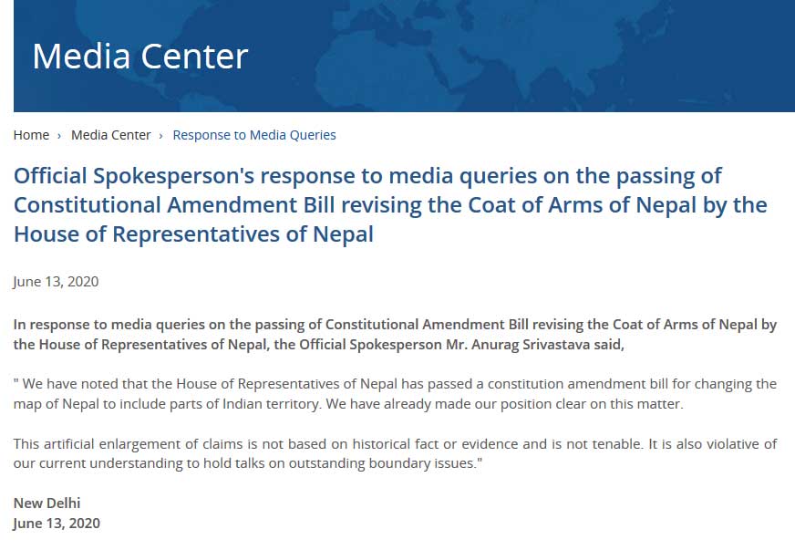 भारतीय विदेश मन्त्रालयका प्रवक्ताअनुराग श्रीवास्तवले पत्रकारहरूको जवाफ दिँदै शनिबार भने, ‘हामीले नोटिस ग¥यौं । नेपालको प्रतिनिधि सभाले नेपालको नक्शा बदल्नको लागि संविधान संशोधन विधेयक पारित गरेको छ ।’