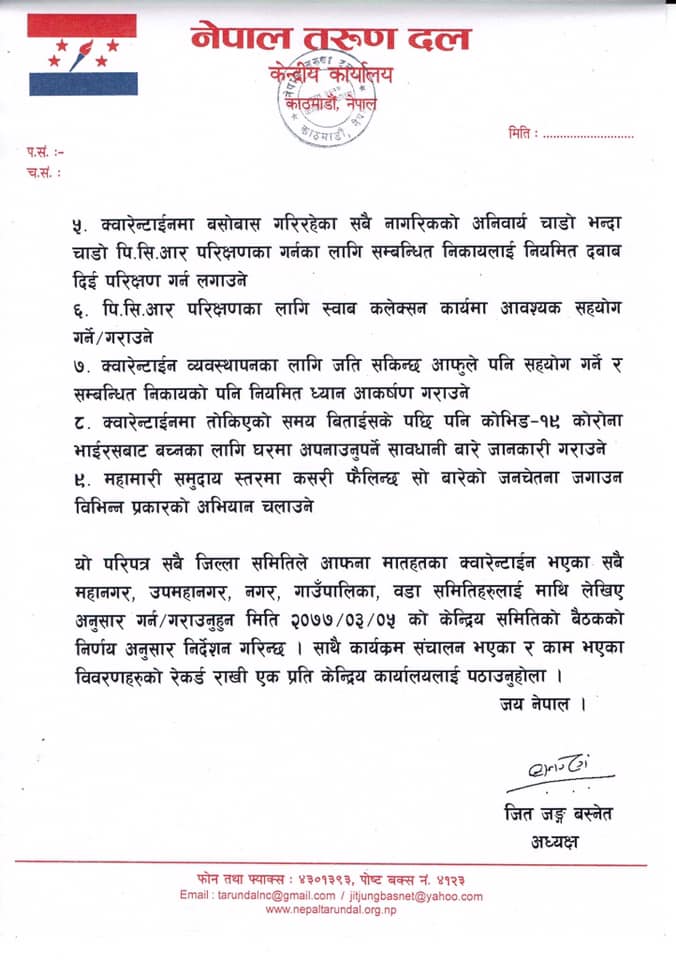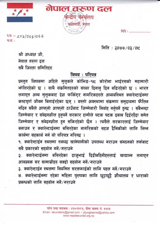 तरुण दलका अध्यक्ष जितजंग बस्नेतले मंगलबार परिपत्र जारी गरेर कम्युनिस्ट सरकारका कारण क्वारेन्टिनको अवस्था झन् दैनिय अवस्थामा पुगेको भन्दै सहयोगका लागि ७७ वटा जिल्लाका तरुणहरूलाई निर्देशन दिएका हुन् ।