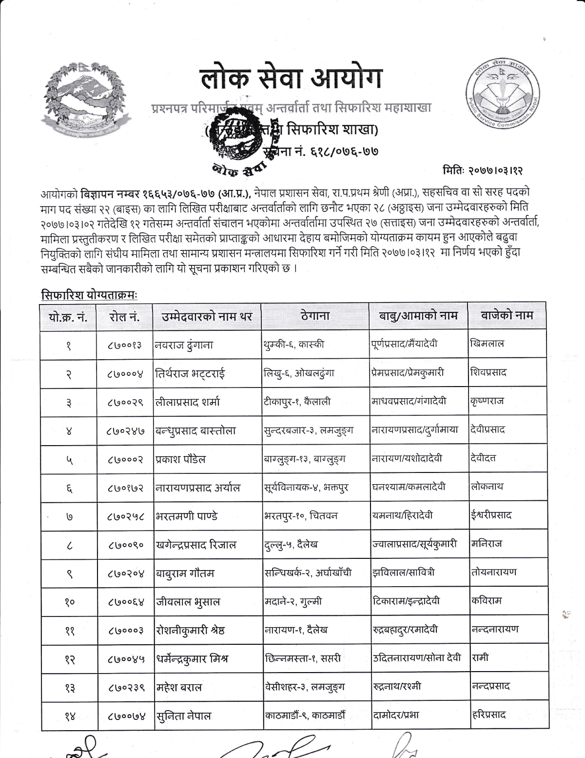 आयोगद्वारा शुक्रबार सार्वजनिक भएको सूचनामा लिखित र अन्तर्वार्तामा उत्तीर्ण २२ जना उप–सचिवहरूलाई सह–सचिवमा बढुवाका लागि सिफारिस गरिएको जनाइएको छ ।