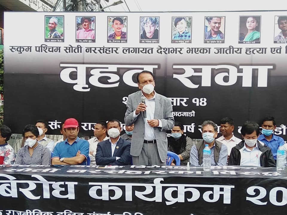 कांग्रेस नेतृत्वको संयुक्त राजनीतिक दलित संघर्ष समितिले आइतबार काठमाडौंको नयाँ वानेश्वरमा आयोजना गरेको वृहत विरोध सभालाई सम्बोधन गर्दै डा.महतले सत्तारुढ दलका नेताहरू रुकुम पश्चिमको हत्याकाण्डलाई राजनीतिक संरक्षण दिएर दोषीलाई बचाउन खोजेको आरोप लगाए । उनले रुकुम पश्चिमको घटनाका दोषीलाई उन्मुक्ति दिन खोजिए कांग्रेसले खबरदारी गर्ने चेतावनी दिए ।