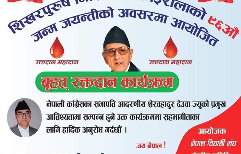 नेपाली कांग्रेसका नेता गिरिजाप्रसाद कोइरालाको ९६औँ जन्मजयन्तीका अवसरमा नेविसंघले रक्तदान कार्यक्रम गर्न लागेको हो ।