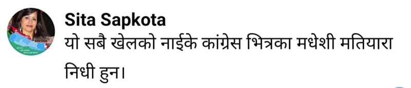 यसअघि संयोजक सापकोटाले कांग्रेसका उपसभापति विमलेन्द्र निधिलाई मधेशीको मतियार भएको आरोप लगाएर सामाजिक सञ्जालमा अभिव्यक्ति दिएकी थिइन् ।