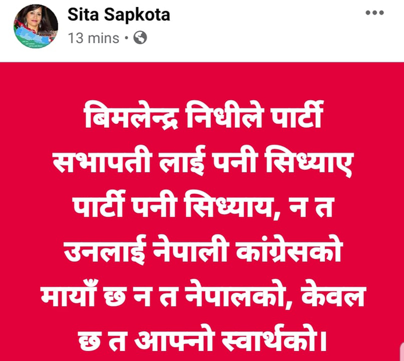 उपसभापति निधिले पार्टी र सभापति शेरबहादुर देउवालाई सिध्यायको भन्दै आफ्नो फेसबुक टाइमलाइनमा स्ट्याटस लेखेपछि सापकोटाविरुद्ध पार्टी कार्यालयमा उजुरी परेको थियो ।