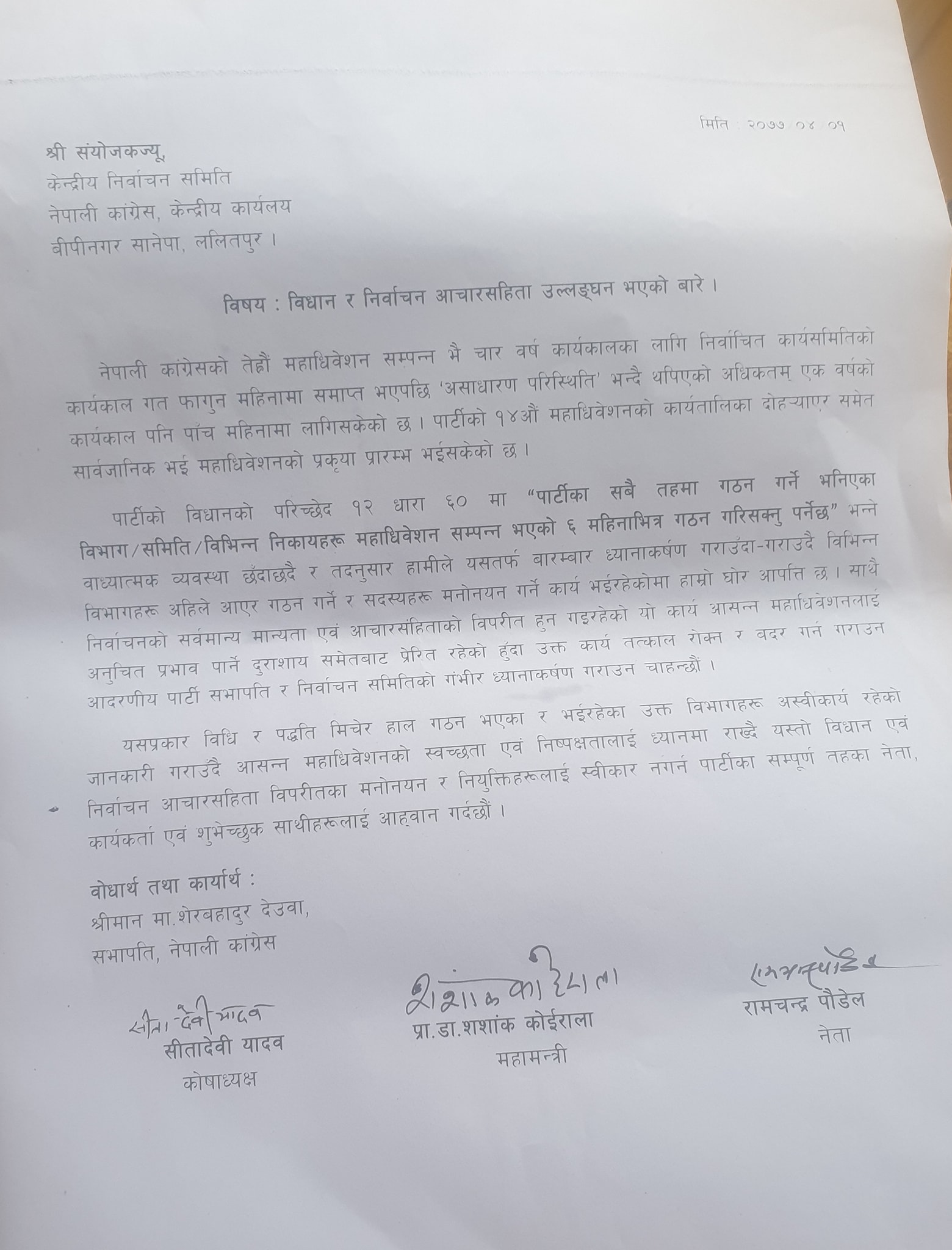 पौडेल, डा.कोइराला र यादबले बिहीबार केन्द्रीय निर्वाचन समितिमा देउवाविरुद्ध उजुरी दिएका हुन् । उनीहरूले उजुरीको बोधार्थ सभापति देउवालाई दिएका छन् ।