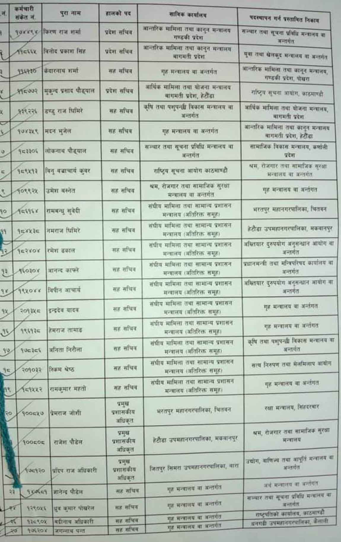 भरतपुर महानगरपालिका, चितवनका सहसचिव प्रेमराज जोशी रक्षा मन्त्रालय, हेटौडा उपमहानगरपालिका, मकवानपुरका सहसविचव राजेश पौडेल श्रम रोजगार तथा सामाजिक सुरक्षा मन्त्रालय, जितपुर सिमरा उपमहानगरपालिका, बाराका सहसचिव प्रदीपराज अधिकारी उद्योग वाणिज्य तथा आपूर्ति मन्त्रालय सरुवा गरिएको छ ।