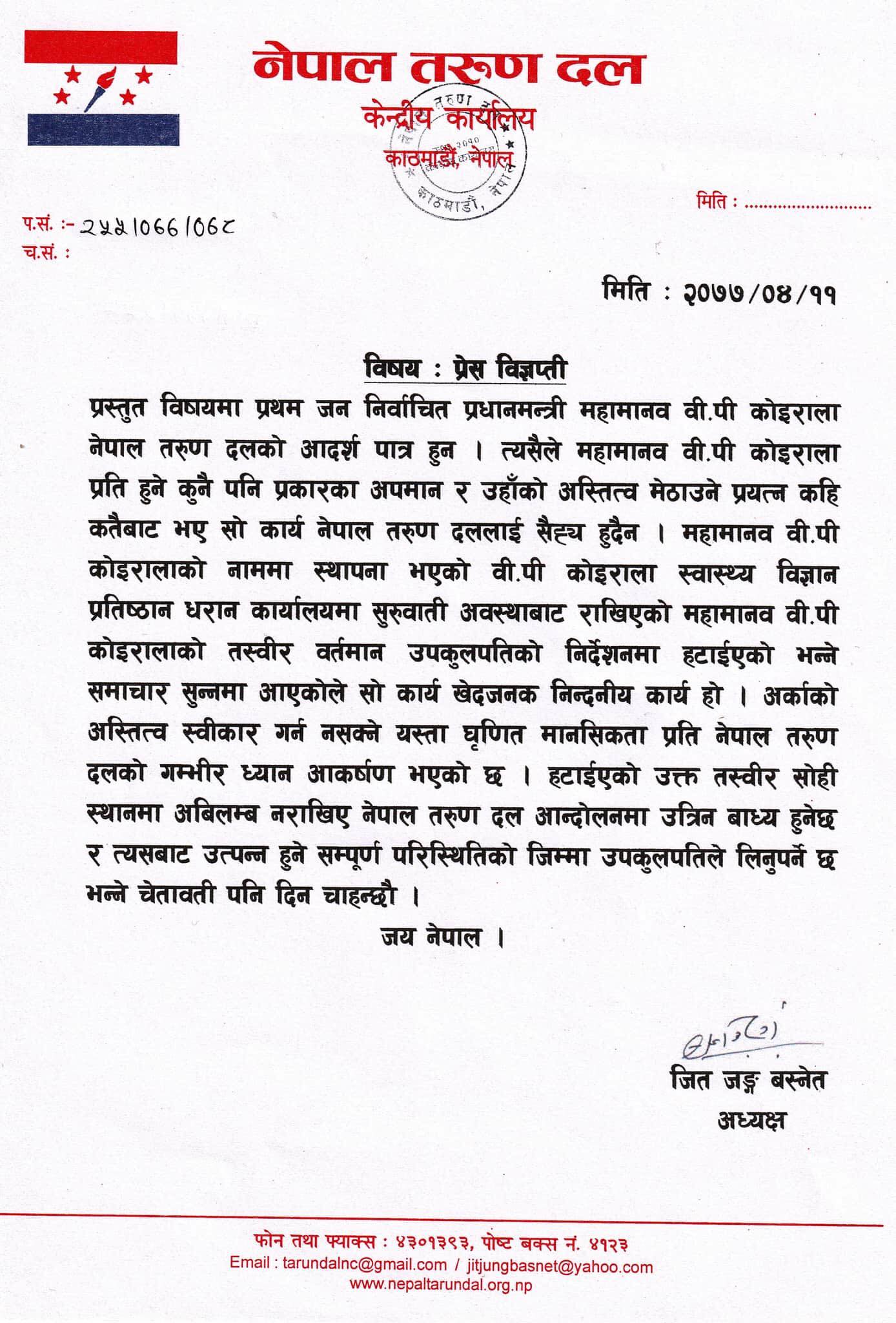‘प्रथम जननिर्वाचित प्रधानमन्त्री महामानव वीपी कोइराला नेपाल तरुण दलको सम्मानित आदर्श पात्र हुन्’, विज्ञप्तिमा भनिएको छ, ‘त्यसैले महामानव वीपी कोइरालाप्रति हुने कुनै पनि प्रकारका अपमान र उहाँको अस्तित्व मेटाउने प्रयत्न कहिँ कतैबाट भए सो कार्य नेपाल तरुण दललाई सैह्य हुँदैन ।’