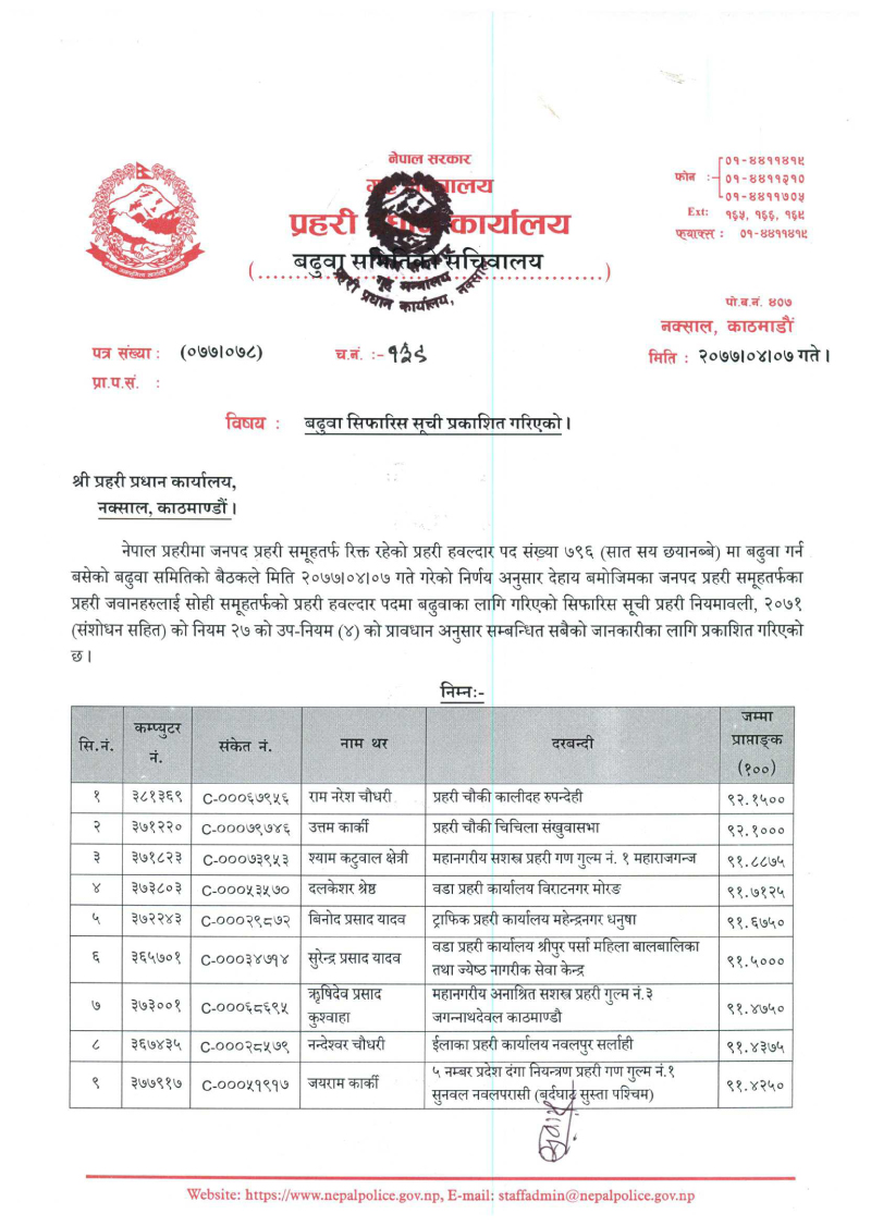 बढुवा सिफारिस समितिले ७९६ जना जवानलाई हवल्दारमा बढुवाका लागि सिफारिस गरेको विज्ञप्तिमा उल्लेख छ ।