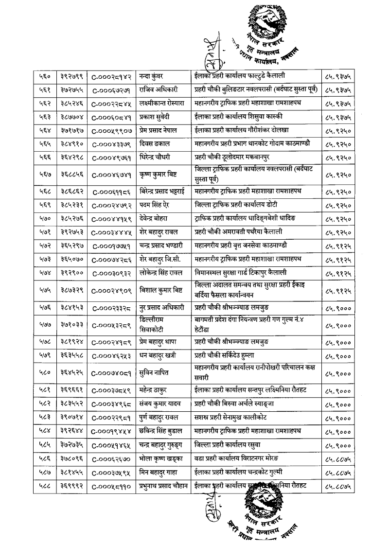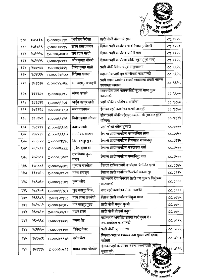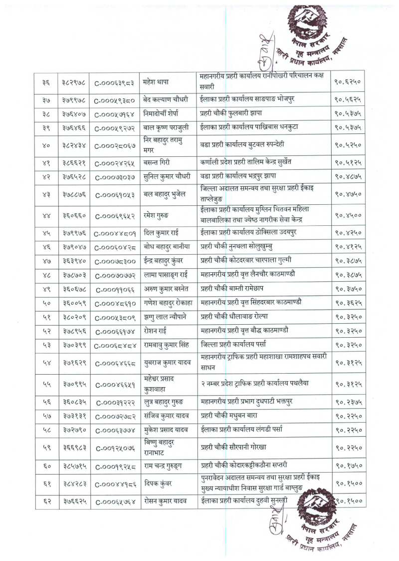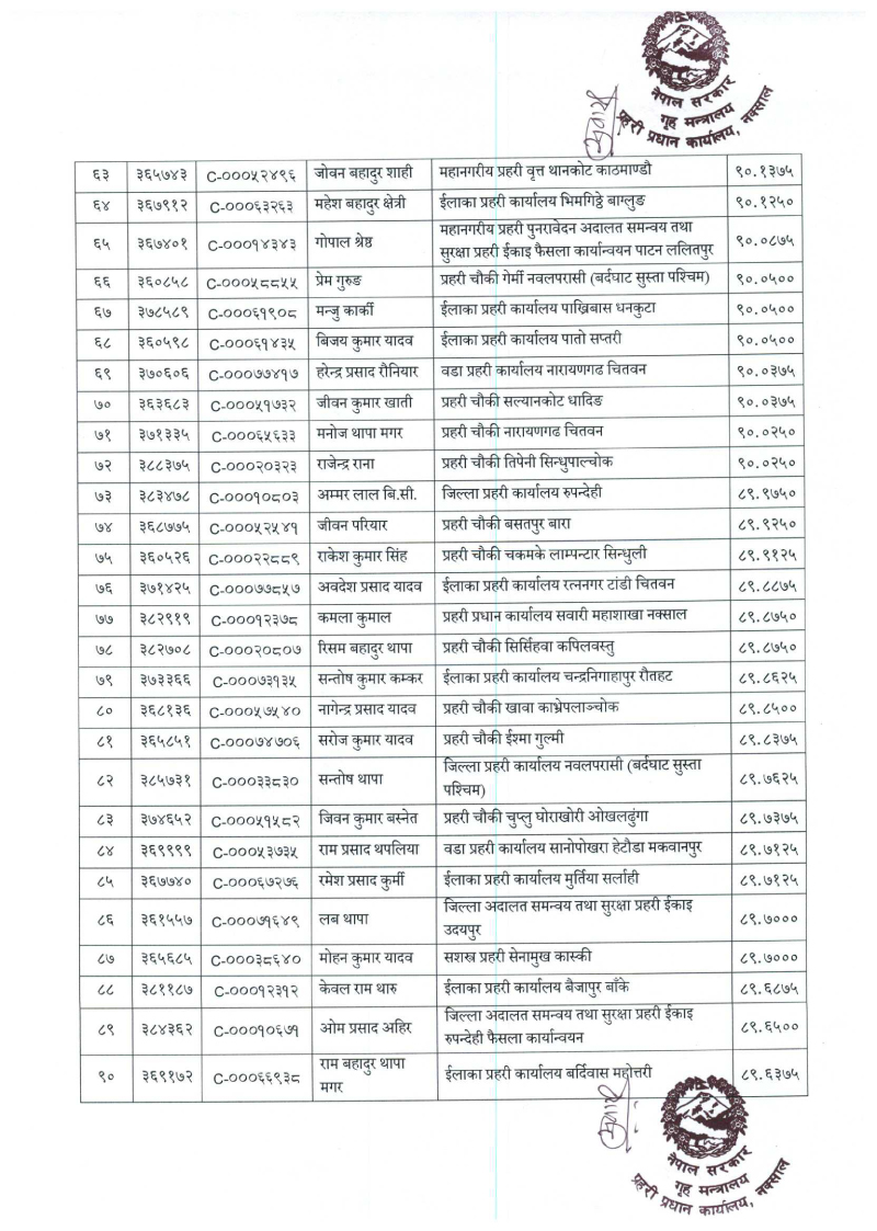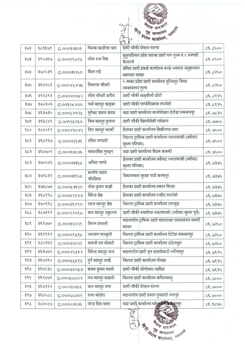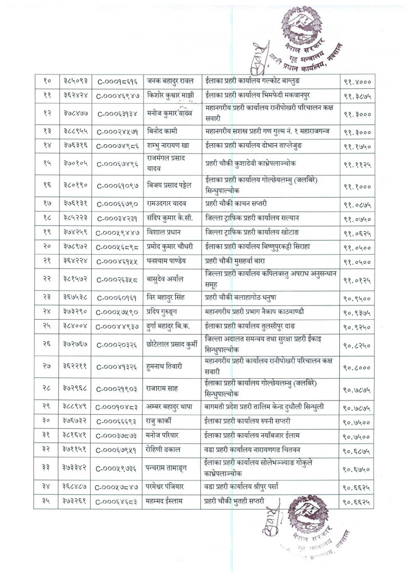 तेस्रो नम्बरमा वडा प्रहरी कार्यालय विराटनगर मोरङका दलकेशर श्रेष्ठ रहेका छन् । सबैभन्दा पुच्छारमा ७९६औँ स्थानमा प्रहरी चौकी विरपुर रुद्रपुर चोक कपिलवस्तुका रामबहादुर कुँवर रहेका छन् ।