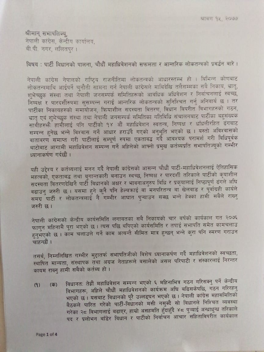 पौडेल–कोइराला समूहले बिहीबार देउवालाई पार्टी केन्द्रीय कार्यालय सानेपामा ज्ञापन पत्र बुझाउनुका साथै पत्रकार सम्मेलन गरेर १४औँ महाधिवेशन शुरु भइसकेको अवस्थामा विभागहरू गठन, नेताहरूलाई अनुशासनको कारबाही, क्रियाशील सदस्यता वितरण जस्ता कुराहरूमा हस्तक्षेप नगर्न माग गरेका हुन् ।
