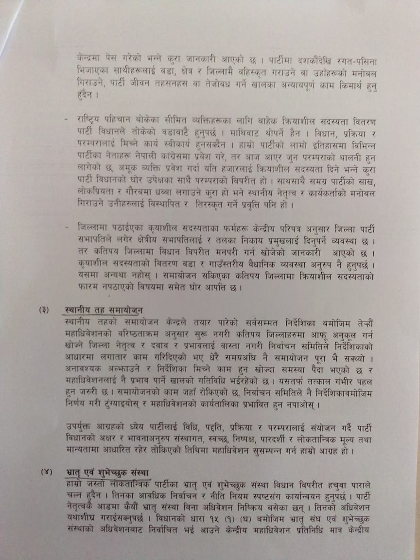 पौडेल–कोइरालाले देउवालाई कामचलाउ सभापति भएको भन्दै पार्टीको विधान र निर्वाचन आचारसंहिता विपरितका कुनै पनि कार्य नगर्न सचेत गराएका छन् । उनीहरूले एकलौटी रुपमा पार्टी कब्जा नगर्न देउवालाई चेतावनी दिएका छन् ।