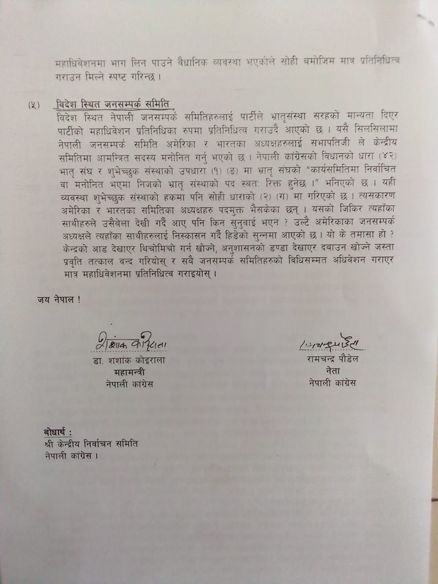 अमेरिका र भारतमा नेपाली जनसम्पर्क समितिका सभापतिहरू केन्द्रीय कार्यसमितिमा मनोनीत भएपछि स्वतः सभापति पदबाट खारेज भएको भन्दै अमेरिकामा सभापतिले समितिका सदस्यहरूलाई कारबाही गरेको भन्दै पौडेल–कोइरालाले आपत्ति जनाएका छन् ।