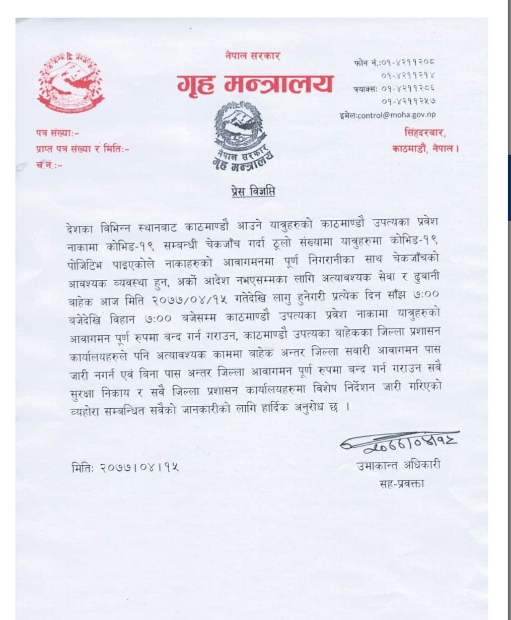 ‘देशका विभिन्न स्थानबाट काठमाडौं आउने यात्रुहरूको काठमाडौं उपत्यका प्रवेश नाकामा कोभिड–१९ सम्बन्धी चेकजाँच गर्दा ठूलो संख्यामा यात्रुहरूमा कोभिड–१९ पोजेटिभ पाइएकाले नाकाहरूको आवागमनमा पूर्ण निगरानीका साथ चेकजाँचको आवश्यक व्यवस्था हुन, अर्को आदेश नभएसम्मका लागि अत्यावसेक सेवा र ढुवानी बाहेक साउन १५ गतेदेखि लागू हुने गरी पत्यके दिन साँझ ७ बजेदेखि बिहान ७ बजेसम्म काठमाडौं उपत्यका बाहेकका जिल्ला प्रशासन कार्यालयहरूले पनि अत्यावश्यक काममा बाहेक अन्तर जिल्ला सवारी अवागमन पास जारी नगर्न एवम् विना पास अन्तर जिल्ला आवागमन पूर्ण रुपमा बन्द गर्न गराउन सबै सुरक्षा निकाय र सबै जिल्ला प्रशासन कार्यालयहरूमा विशेष निर्देशन जारी गरिएको व्यवहोरा अनुरोध छ’, मन्त्रालयका सह–प्रवक्ता अधिकारीद्वारा जारी विज्ञप्तिमा भनिएको छ ।