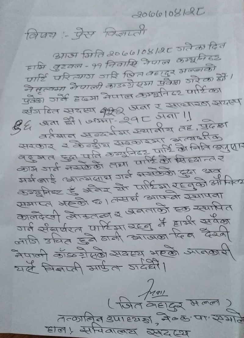 उनले स्थानीय तह, प्रदेश र केन्द्रमा अत्यधिक बहुमतको सरकार हुँदा पनि कम्युनिष्ट पार्टीको नीतिअनुसार काम गर्न नसकेको आरोप लगाएका छन् । मल्लले पार्टीको सिद्धान्त र मर्मलाई आत्मसात गर्न नसकेको हुँदा ‘कम्युनिष्ट हुँ’ भनेर यो पार्टीमा रहनुको औचित्य समाप्त भएको उल्लेख गरिएको छ ।