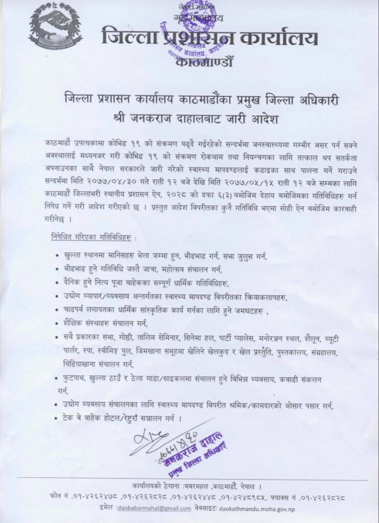 भीडभाड हुने गतिविधि जस्तै जात्रा, महोत्सव सञ्चालन गर्न पनि काठमाडौं जिल्ला प्रशासन कार्यालयले निषेध गरेको छ ।