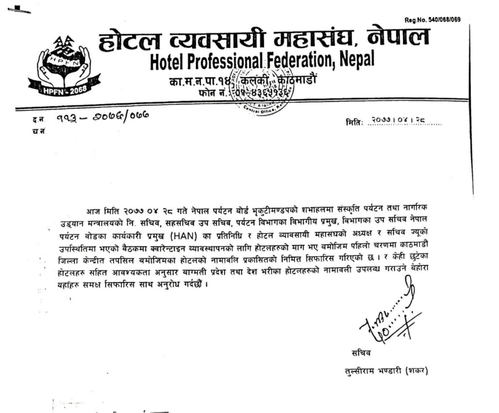 होटेल व्यवसायी महासंघ नेपालले न्युनतम १५ सयमा खान, बस्न, नास्ताको सुविधासहित सेवा दिन तयार रहेको लिखित रुपमा सरकारलाई जानकारी गराइसकेको छ । तर, राजनीतिक चलखेलका आधारमा कथित ठूला होटेलहरूलाई फाइदा हुने गरेर क्वारेन्टिनको व्यवस्था मिलाइएको हो ।