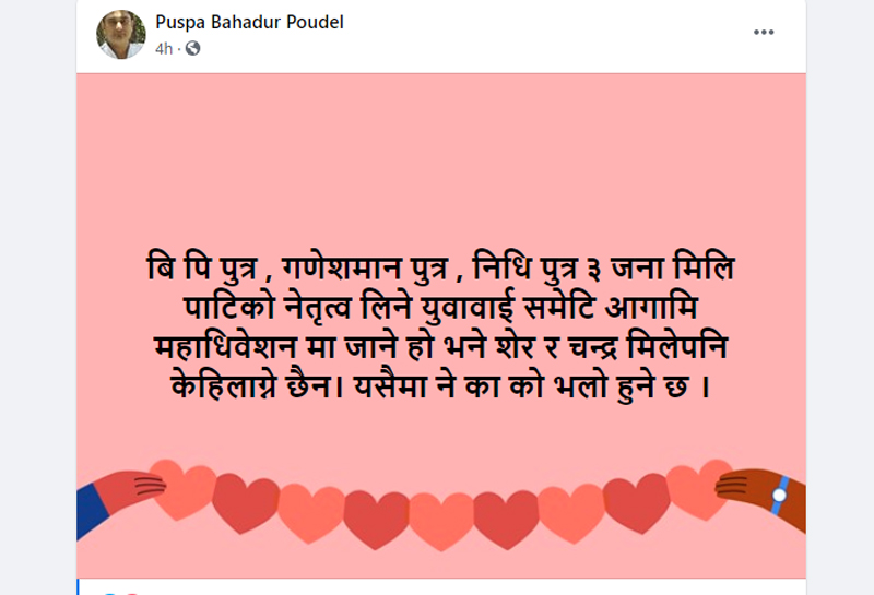 ‘वीपी पुत्र, गणेशमान पुत्र, निधि पुत्र ३ जना मिली पार्टीको नेतृत्व लिने युवालाई समेटी आगामी महाधिवेशनमा जाने हो भने शेर र चन्द्र मिलेपनि केही लाग्नेछैन’, सदस्य पौडेलले लेखेका छन्, ‘यसैमा नेकाको भलो हुनेछ ।’