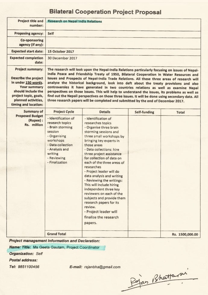 प्रोजेक्ट संयोजकमा डा.भट्टराईले गीता गौतमको नाम राखेका छन् । रकम आफ्नै हस्ताक्षरमा बुझेका छन् ।