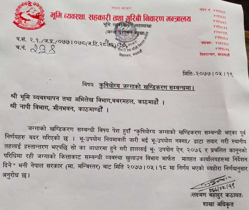 मन्त्रालयको निर्णयमा भनिएको छ, ‘जग्गाको खण्डिकरण सम्बन्धी विषय पेश हुँदा कृषियोग्य जग्गाको खण्डीकरण सम्बन्धी भएका पूर्ण निर्णयहरू बदर गरिएको छ ।’