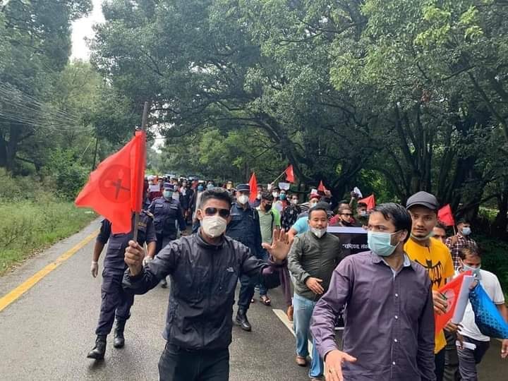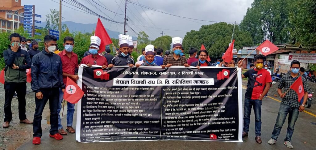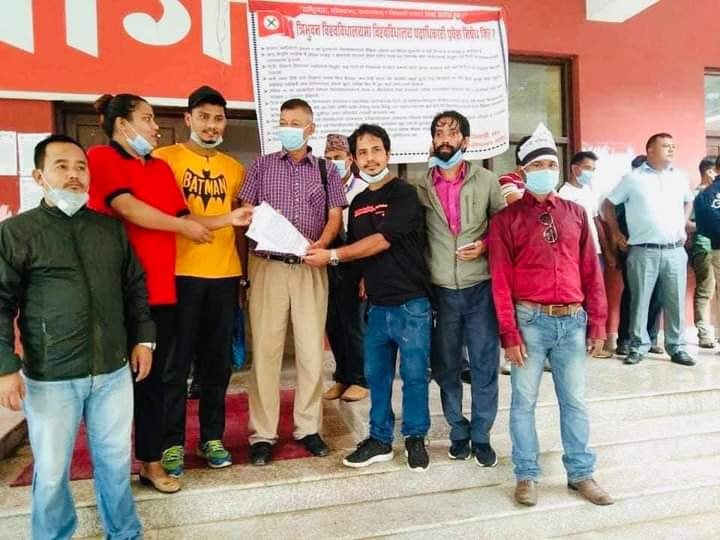 त्रिविमा सत्तारूढ नेपाल कम्युनिष्ट पार्टी नेकपाका कार्यकर्ता भर्ती गरेको भन्दै नेविसंघले निरन्तर प्रदर्शन गर्दै आएको छ।