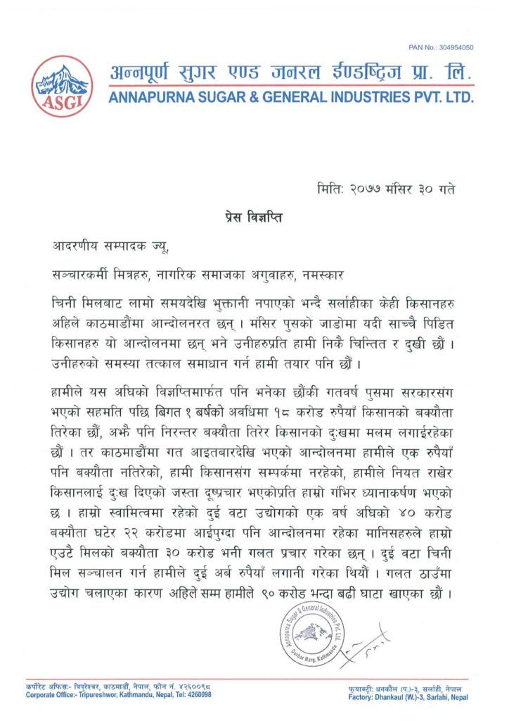 सञ्चालक अग्रवालले आवश्यक सबै प्रमाणसहित किसान आन्दोलनको नाममा भएको दलालको छद्म नाटक सबैले चिन्नुपर्ने बताएका छन् । उनले सच्चिकै किसान र पीडितको माग सम्बोधन गर्न तयार रहेको भन्दै किसानलाई तिर्नुपर्ने ४० करोडमध्ये बाँकी रकम तिरेर २२ करोड मा ल्याएको बताएका छन् । सञ्चालक अग्रवालले आफूले तिर्नुपर्ने ३० करोड भनेर गलत प्रचार गरिएको समेत बताएका छन् । (तस्वीर माइतीघर मण्डलमा धर्ना बसेका किसानहरू)