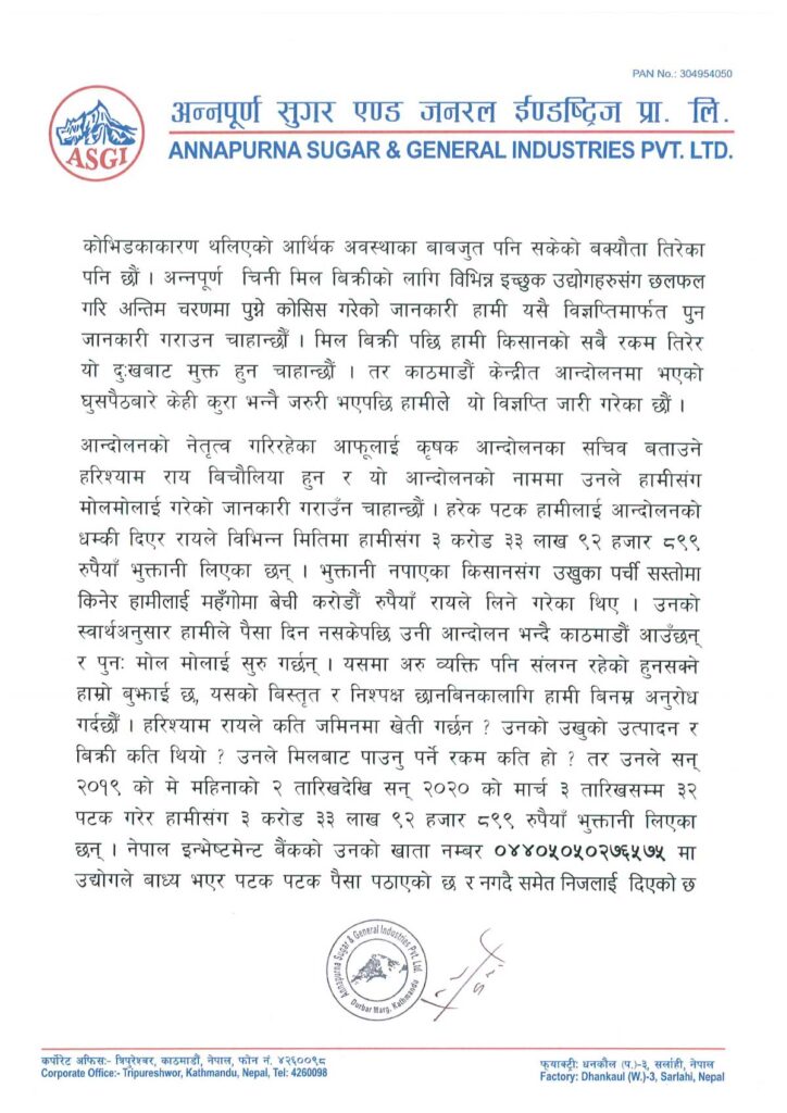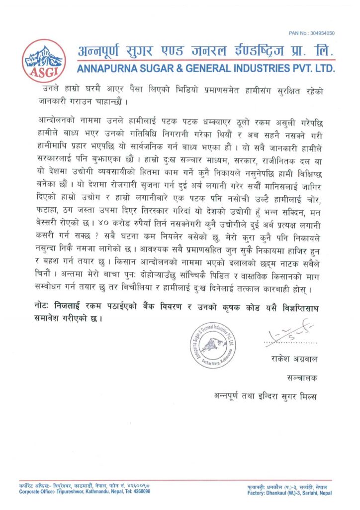 ‘भुक्तानी नपाएका किसानसँग उखुका पर्ची सस्तोमा किनेर हामीलाई महँगोमा बेचेर करोडौं रुपियाँ रायले लिने गरेका छन्’, अग्रवालले भनेका छन्, ‘हरिश्याम रायको स्वार्थअनुसार हामीले पैसा दिन नसकेपछि उनी आन्दोलनभन्दै काठमाडौं आउँछन र पुनः मोलमोलाई शुरु गर्छन् । यसमा अरु व्यक्ति पनि संलग्न रहेको हुनसक्ने हाम्रो बुझाइ छ । यसको बिस्तृत र निष्पक्ष छानबिनका लागि हामी बिनम्र अनुरोध गर्दछौँ ।’