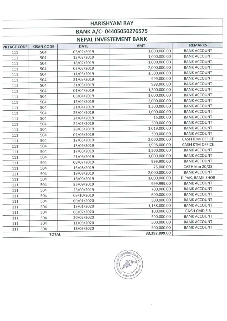 ‘हरिश्याम रायले कति जमीनमा खेती गर्छन् ? उनको उखुको उत्पान र बिक्री कति थियो ? उनले मिलबाट पाउनुपर्ने रकम कति हो ?’, प्रश्न गर्दै सञ्चालक अग्रवालले भनेका छन्, ‘उउनले सन् २०१९ को मे महिनाको २ तारिखदेखि सन् २०२० को मार्च ३ तारिखसम्म ३२ पटक गरेर हामीसँग ३ करोड ३३ लाख ९२ हजार ८ सय ९९ सय रुपियाँ भुक्तानी लिएका छन्’, विज्ञप्तिा भनिएको छ, ‘नेपाल इन्भेष्टमेन्ट बैंकको उनको खाता नम्बर ०४४०५०५०२७६५७५ मा उद्योगले बाध्य भएर पटक–पटक पैसा पठाएको छ र नगद समेत निजलाई दिएको छ । उनले हाम्रो घरमै आएर पैसा लिएको भिडियो प्रमाण समेत हामीसँग सुरक्षित रहेको जानकारी गराउन चाहन्छौँ ।’