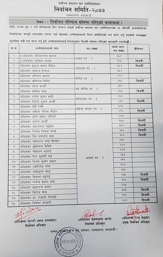 काठमाडौं । सर्वोच्च अदालत बार एसोसिएशनको नयाँ कार्यसमितिमा नेपाली कांग्रेस निकटको लोकतान्त्रिक समूहले सानदार विजय हासिल गरेको छ ।