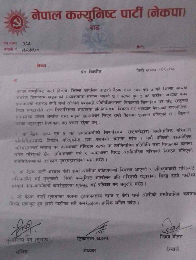 संयुक्त विज्ञप्तिमा नेकपा दाङका ईञ्चार्ज जीवन गौतम, अध्यक्ष टीकाराम खड्का र सचिव तुलसीराम पुनले हस्ताक्षर गरेका छन् ।