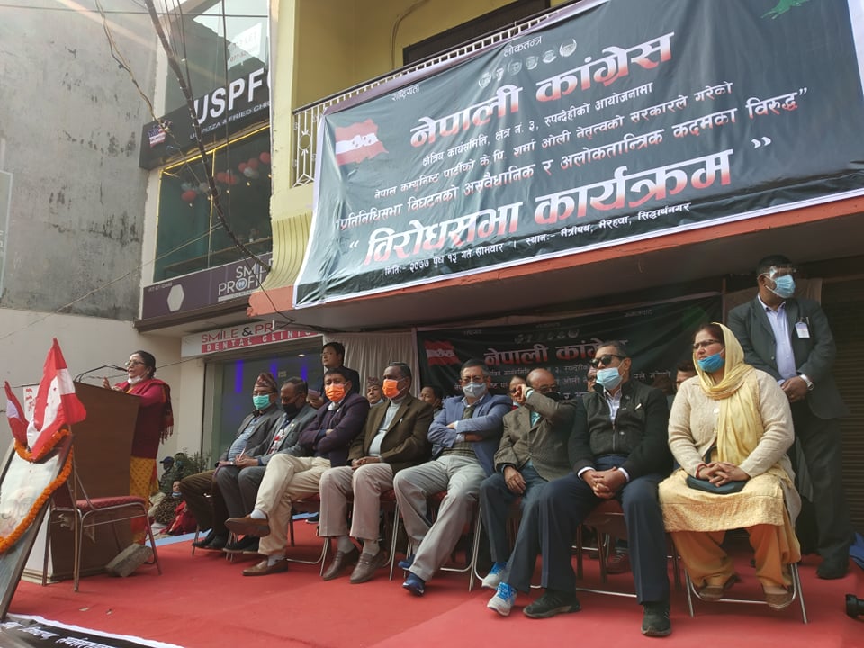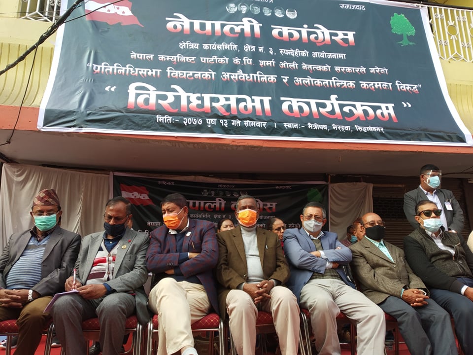विरोध सभा क्षेत्रीय सभापति मातृका यादवको सभापतित्वमा भएको थियो । कार्यक्रममा कांग्रेस नेताहरू रामचन्द्र ढकाल, रामकृष्ण खाँण, ईस्तियाक अहमद, रमा अर्याल, पुष्पा थरुनी, विमल ढकाल, प्रेम फौजदार, पुरण श्रेष्ठ, कृष्णबहादुर विष्ट, हरिध्वज मल्ल लगायत हजारौँ कार्यकर्ताको उपस्थिति रहेको थियो ।
