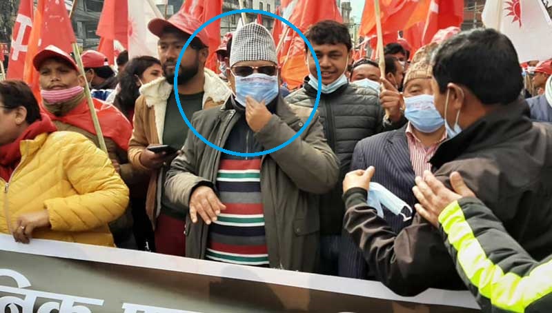 जुलुसको नेतृत्व गरेका महराले ढपक्कै मुख छोपिने गरेर सर्जिकल मास्क लगाएका छन् । उनले कालो चस्मा र टोपी पनि लगाएका छन् । मस्क, टोपी र चस्मा लगाएका महरालाई देख्नेले झ्याप्प चिन्न सक्दैनन् । कोरोनाबाट बच्न उनले मास्क लगाएका हुन् । महरालाई चिन्नै नसकिने अवस्थामा मास्क, चस्मा र टोपी लगाएको देखेपछि कार्यकर्ताहरूनै अचम्ममा परेका छन् ।
