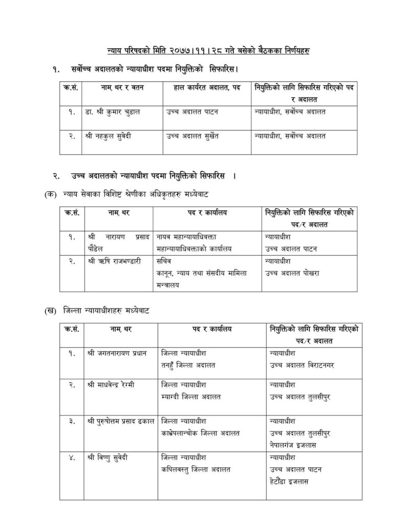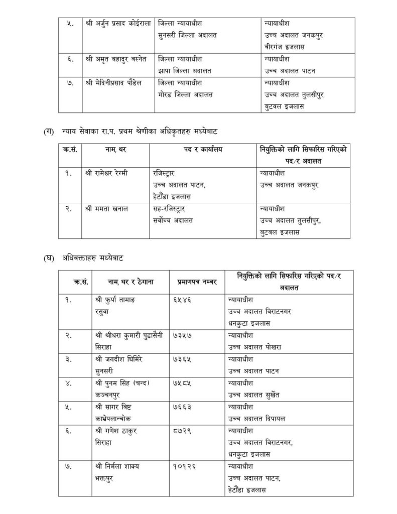 जिल्ला न्यायाधीशहरुबाट जगतनारायण प्रधान, माधवेन्द्र रेग्मी, पुरुषोत्तम प्रसाद ढकाल, विष्णु सुवेदी, अर्जुनप्रसाद कोइराला, अमृतबहादुर बस्नेत, मेदिनीप्रसाद पौडेलको नाम सिफारिस भएको छ ।