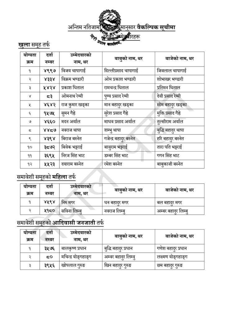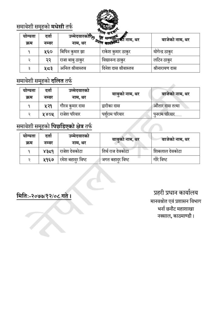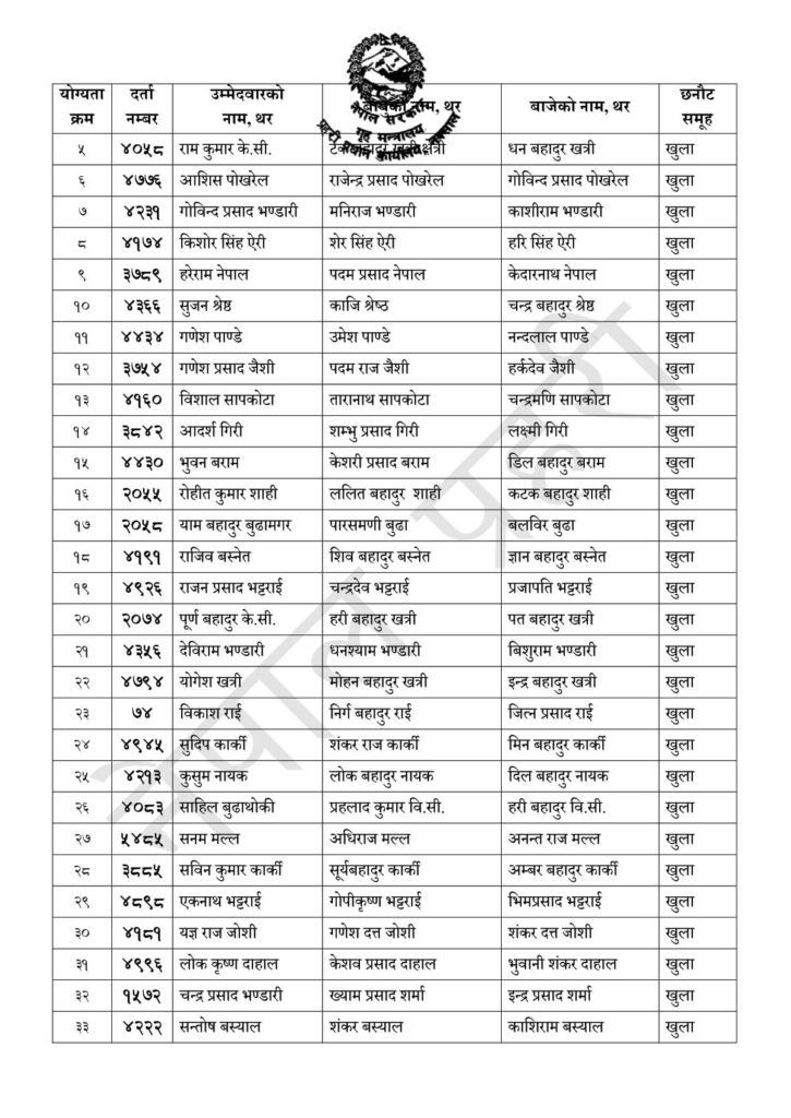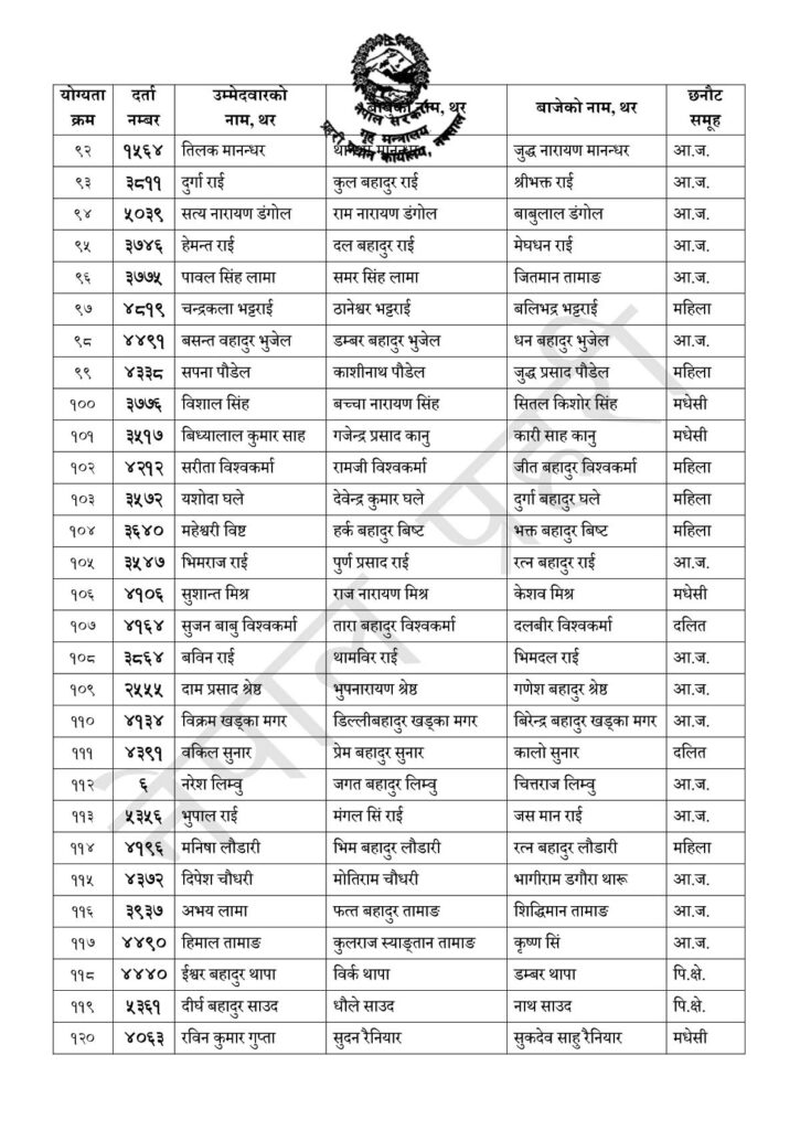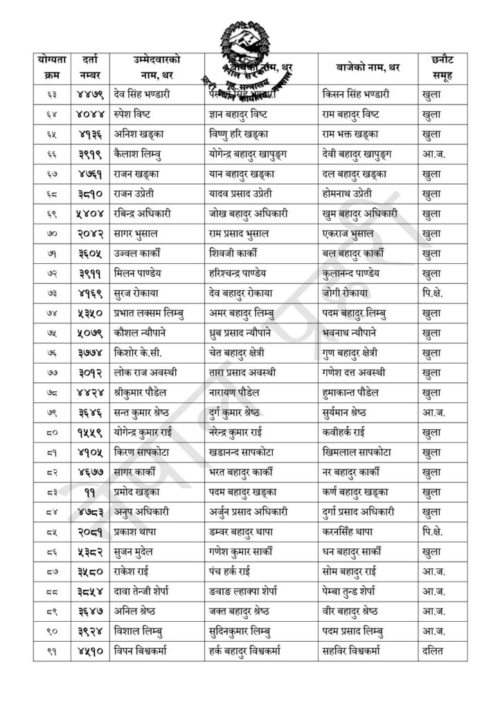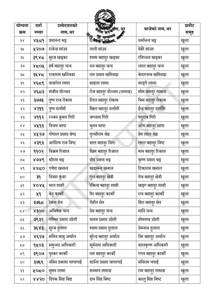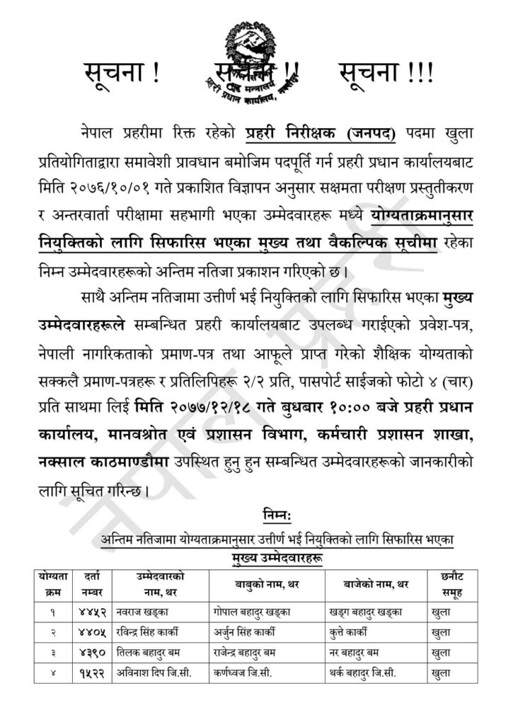 निरीक्षकमा नवराज खड्काले १ नम्बरमा नाम निकालेका छन् । दोस्रो नम्बरमा रविन्द्र सिंह कार्की र तेस्रो नम्बरमा तिलकबहादुर बम उत्तीर्ण भएका छन् ।