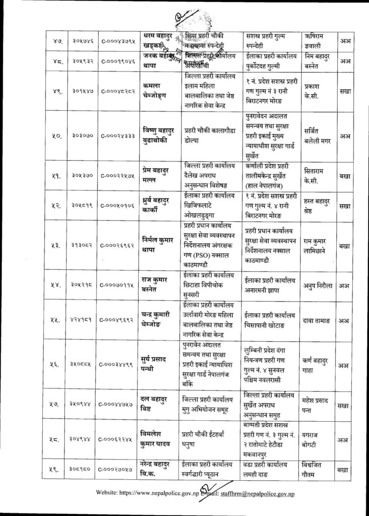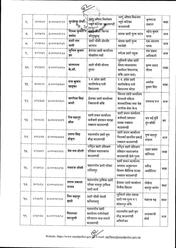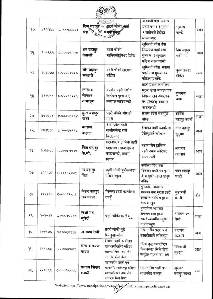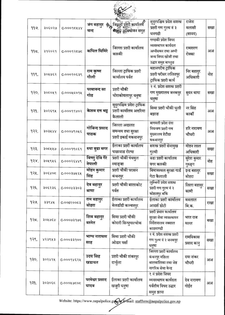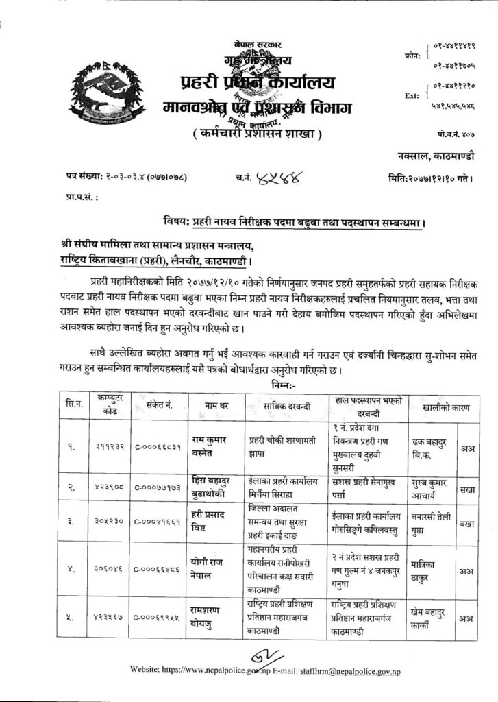 पहिलो नम्बरमा बढुवा हुनेमा रामकुमार बस्नेत रहेका छन् । बस्नेतलाई १ नं. प्रदेश दंगा नियन्त्रण प्रहरी गण मुख्यालय दुहवी सुनसरीमा पदस्थापना गरिएको छ ।