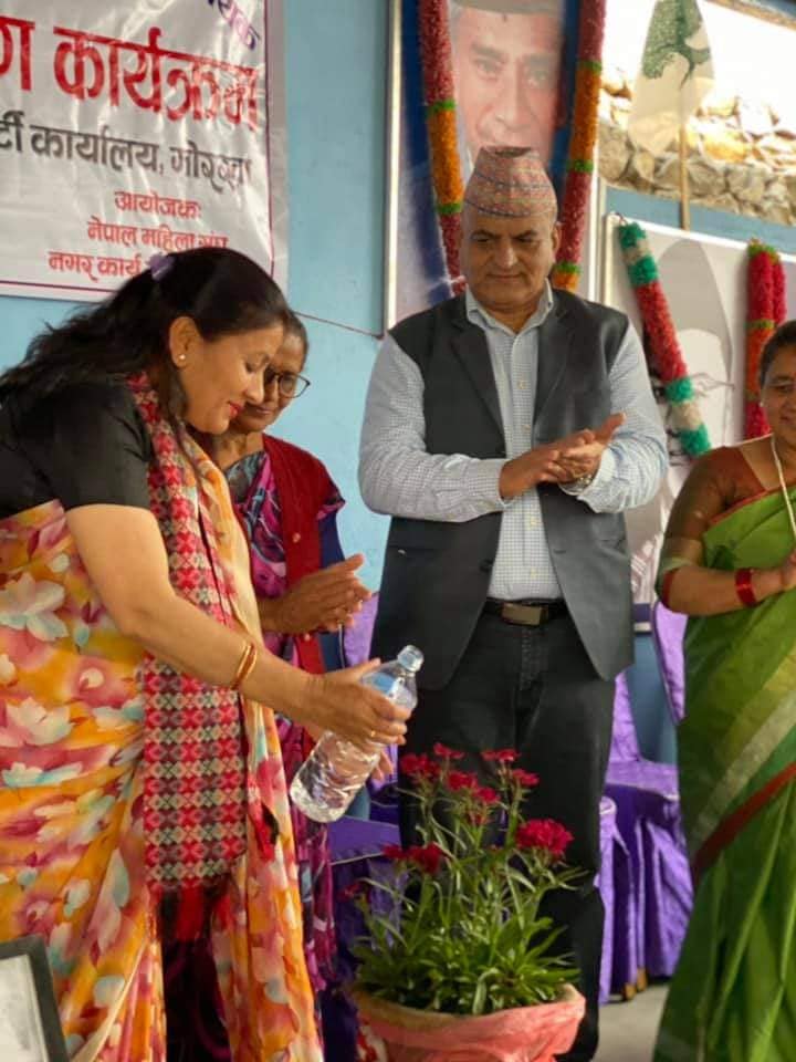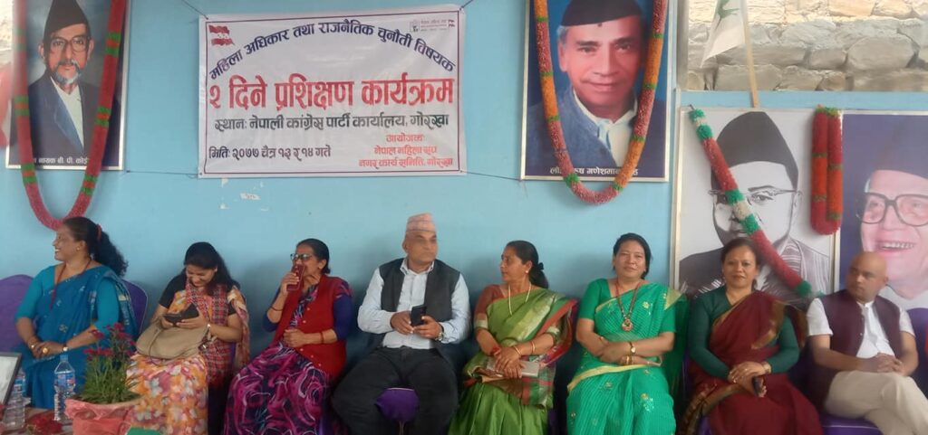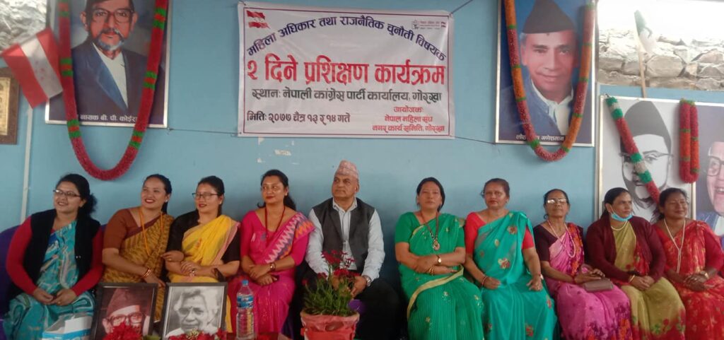 नेपाल महिला संघ, नगर कार्यसमिति गोरखाले शुक्रबार गोरखामा आयोजना गरेको प्रशिक्षणमा नेताहरूले कांग्रेसले संविधानले व्यवस्था गरेअनुसार महिलाहरूलाई पार्टीभित्र स्थान दिएको बताए ।