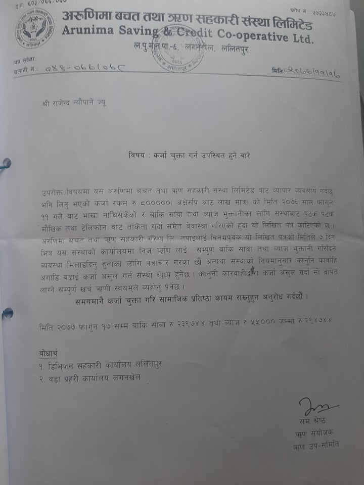 लगनखेल । ललितपुरको लगनखेलस्थित अरुणिमा बचत तथा ऋण सहकारी संस्था लिमिटेडले राजेन्द्र न्यौपानेलाई कर्जा चुक्ता गर्न पत्र पठाएको छ ।